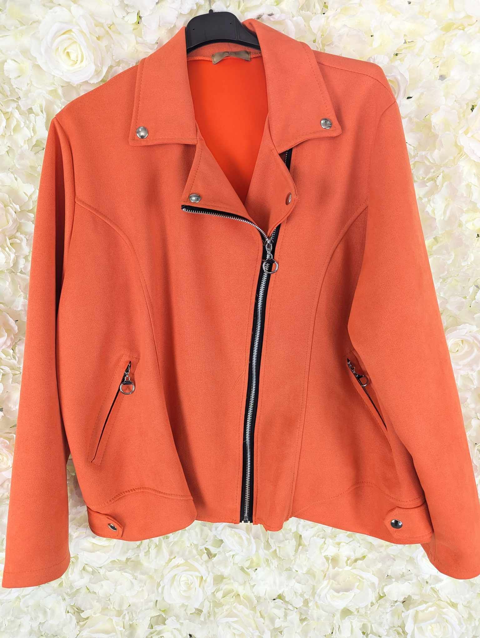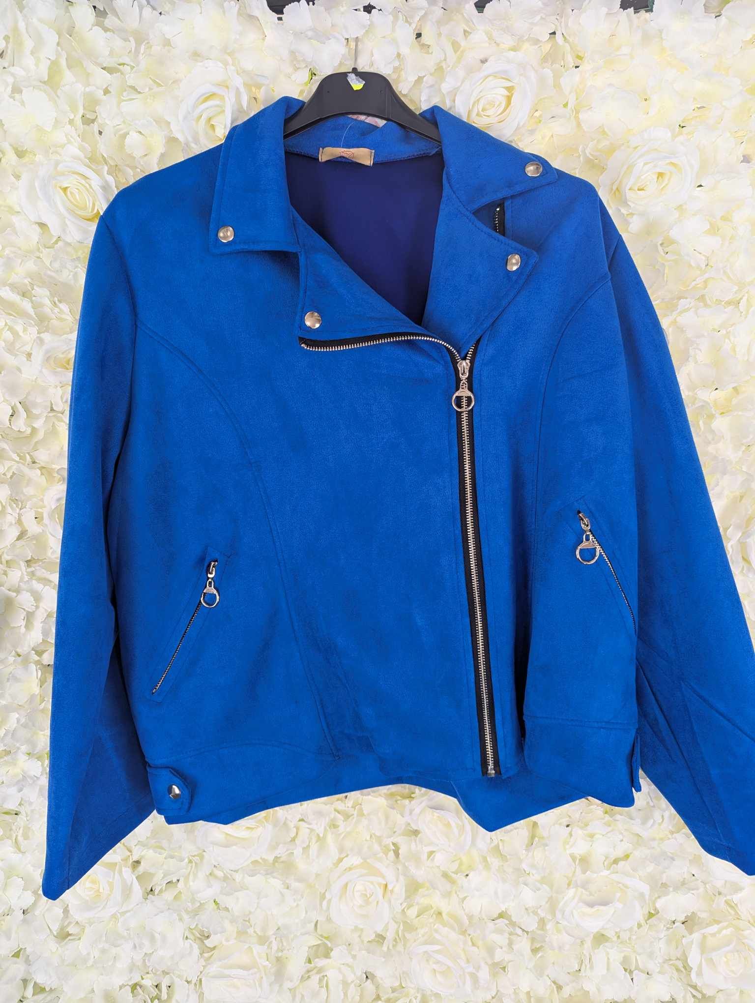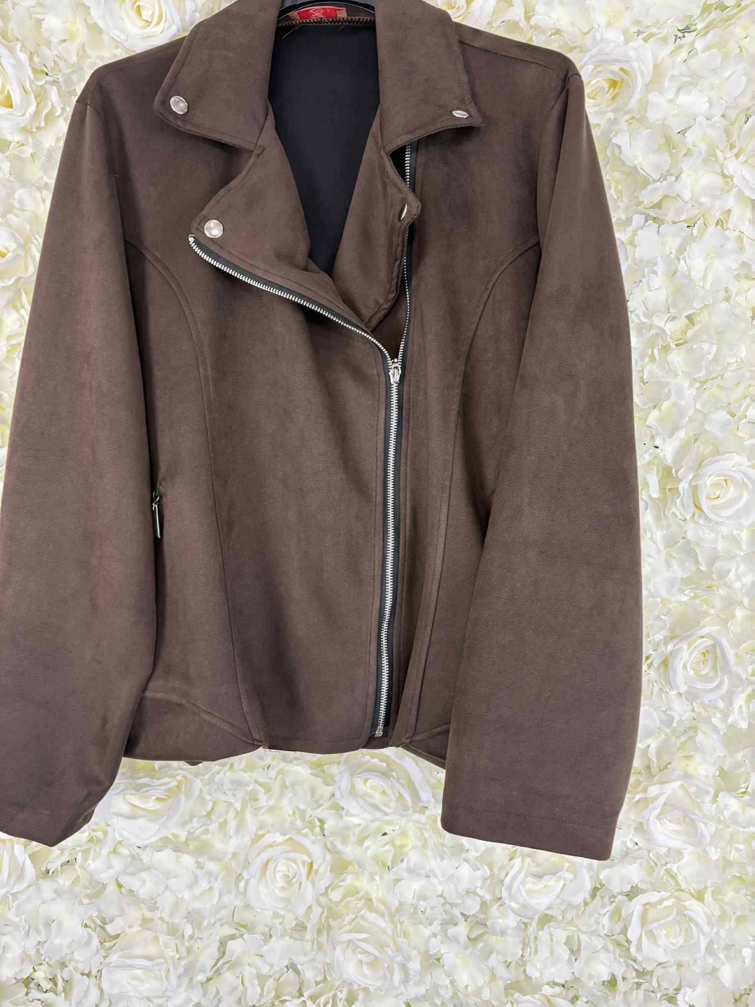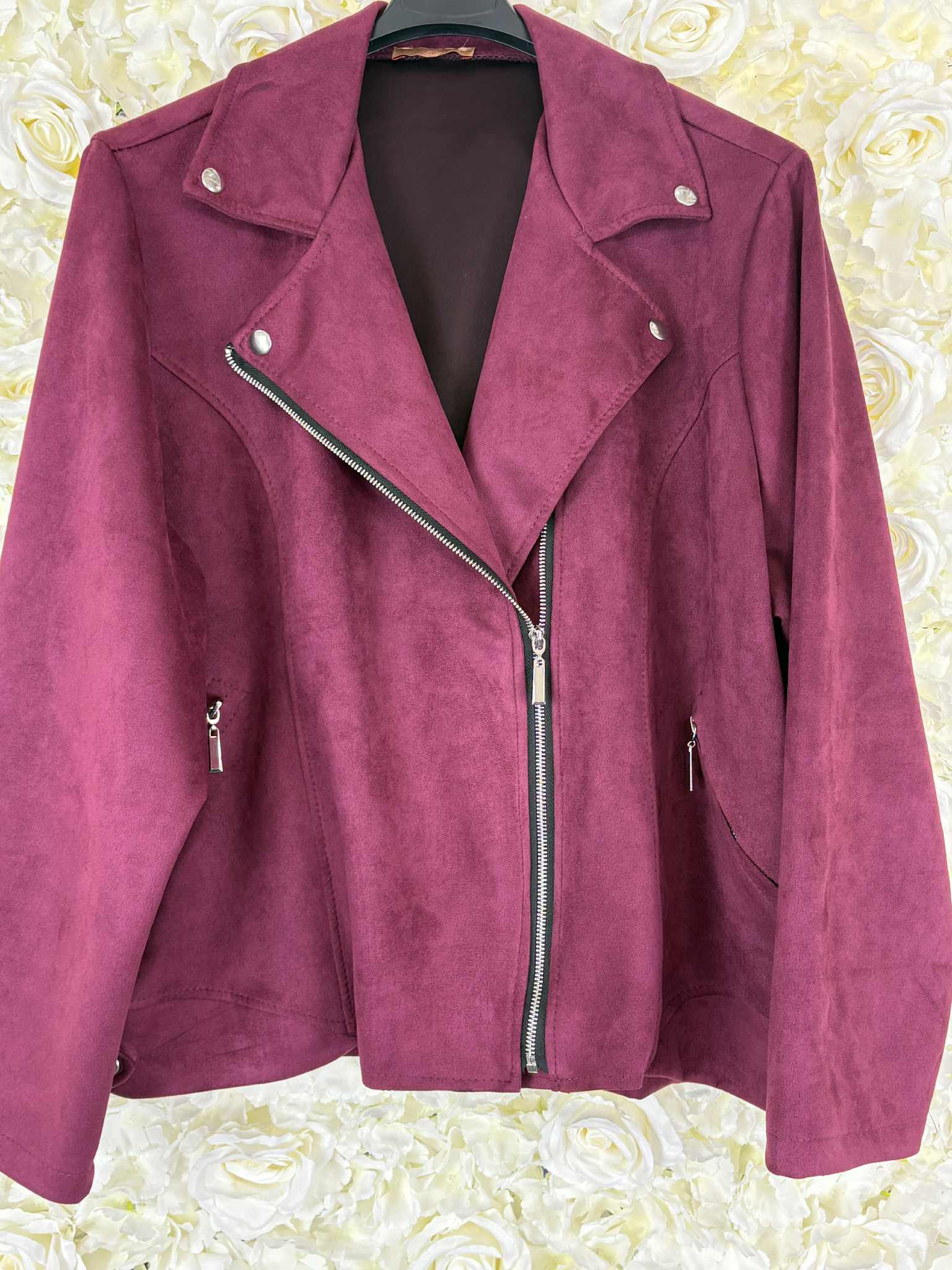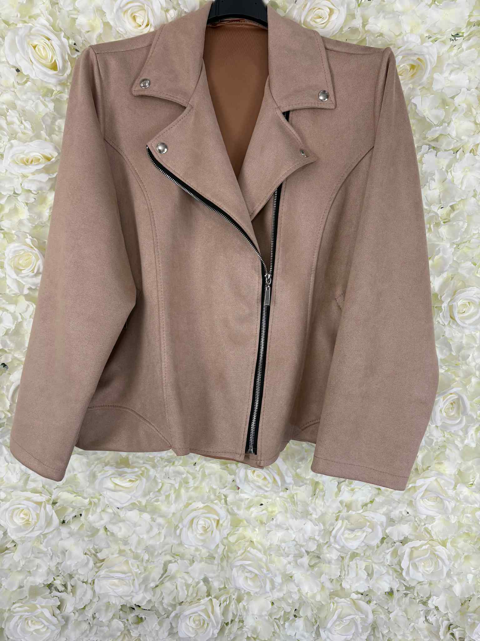 Bang on trend this super stylish suedette biker jacket. Zip fastening with zip up pockets and popper fastening at the top. Its really soft and has some stretch.