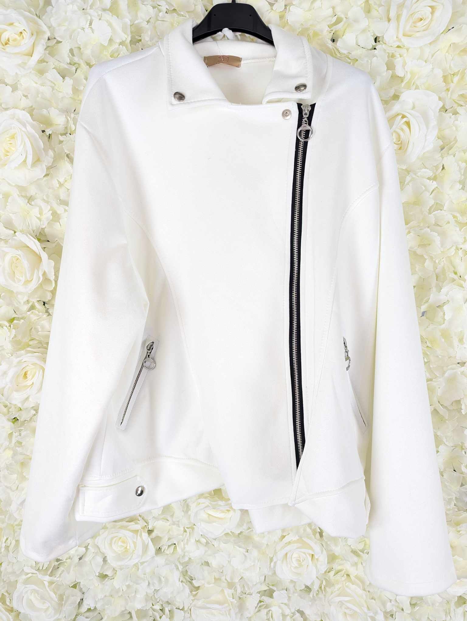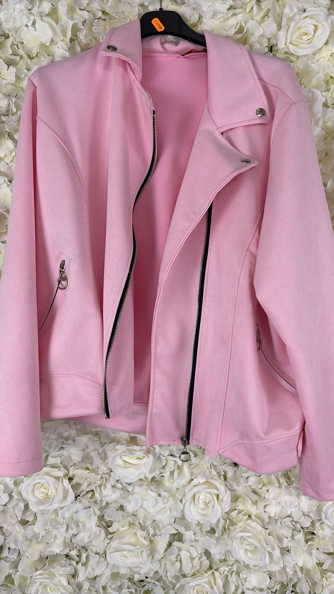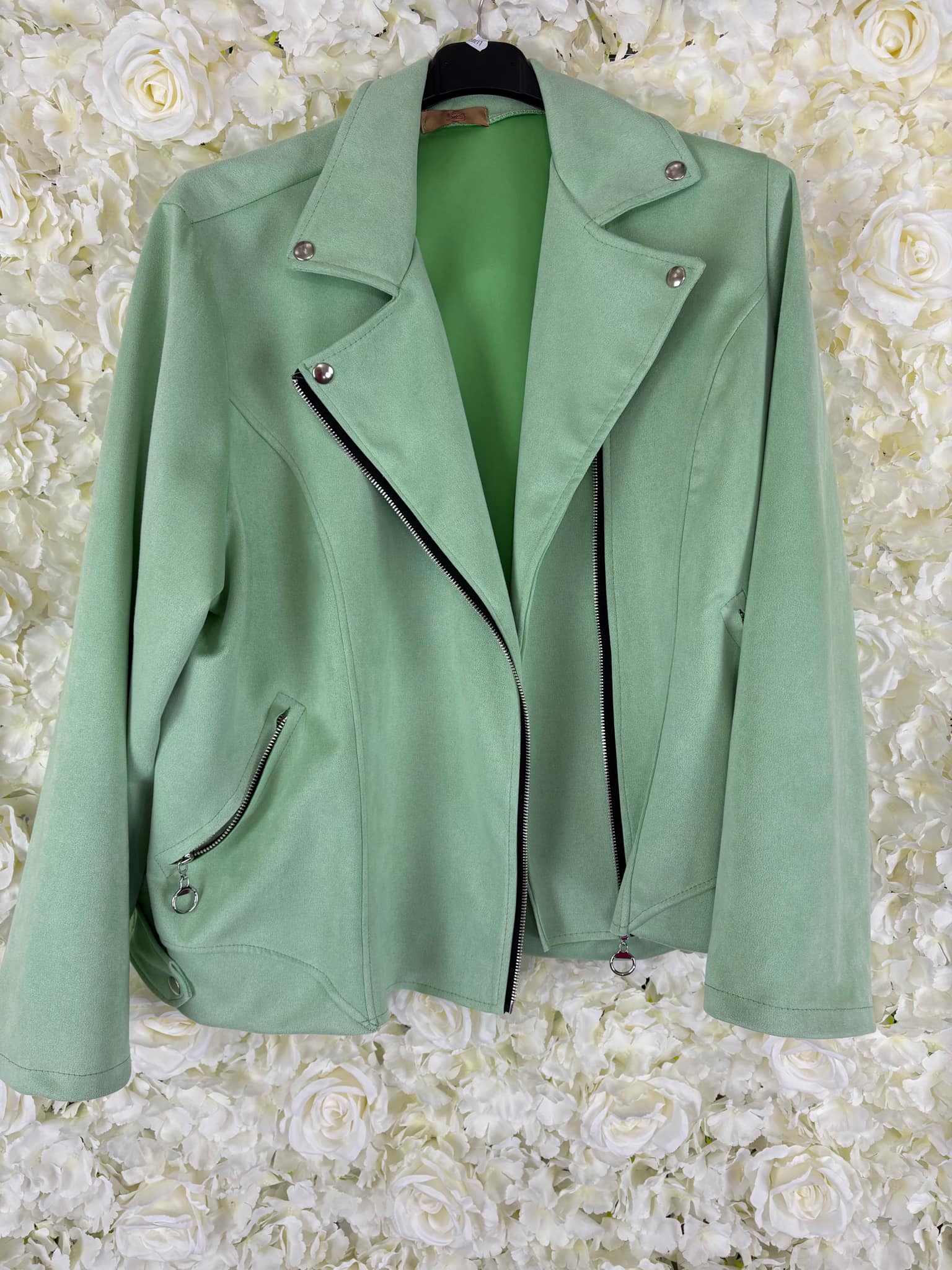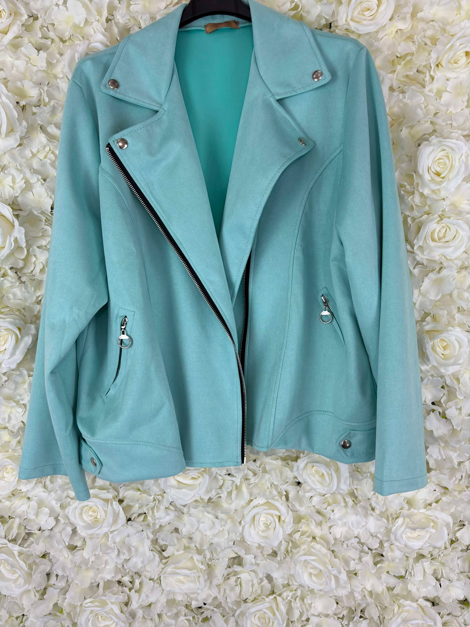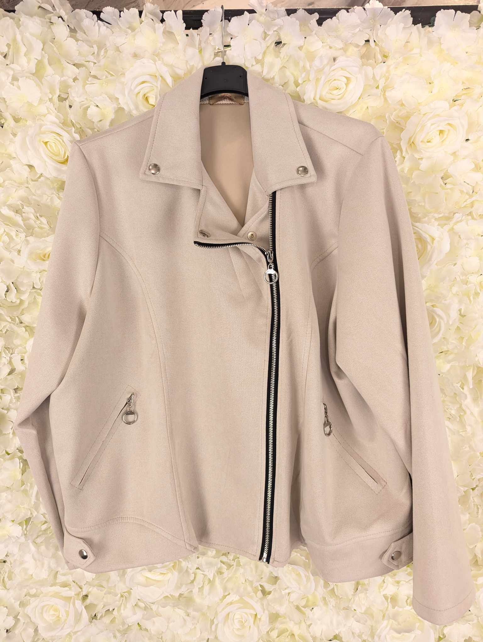 Bang on trend this super stylish suedette biker jacket. Zip fastening with zip up pockets and popper fastening at the top. Its really soft and has some stretch.