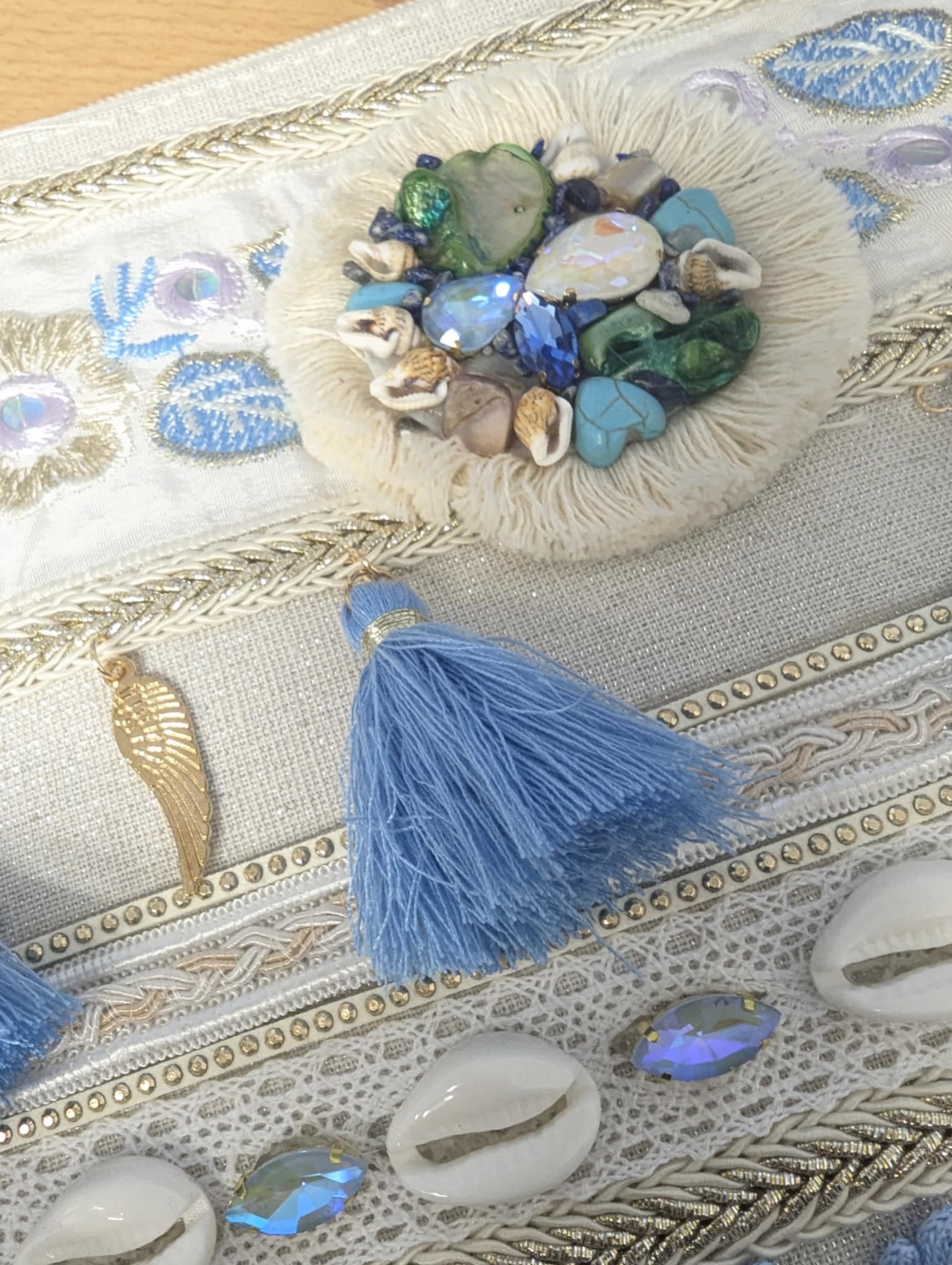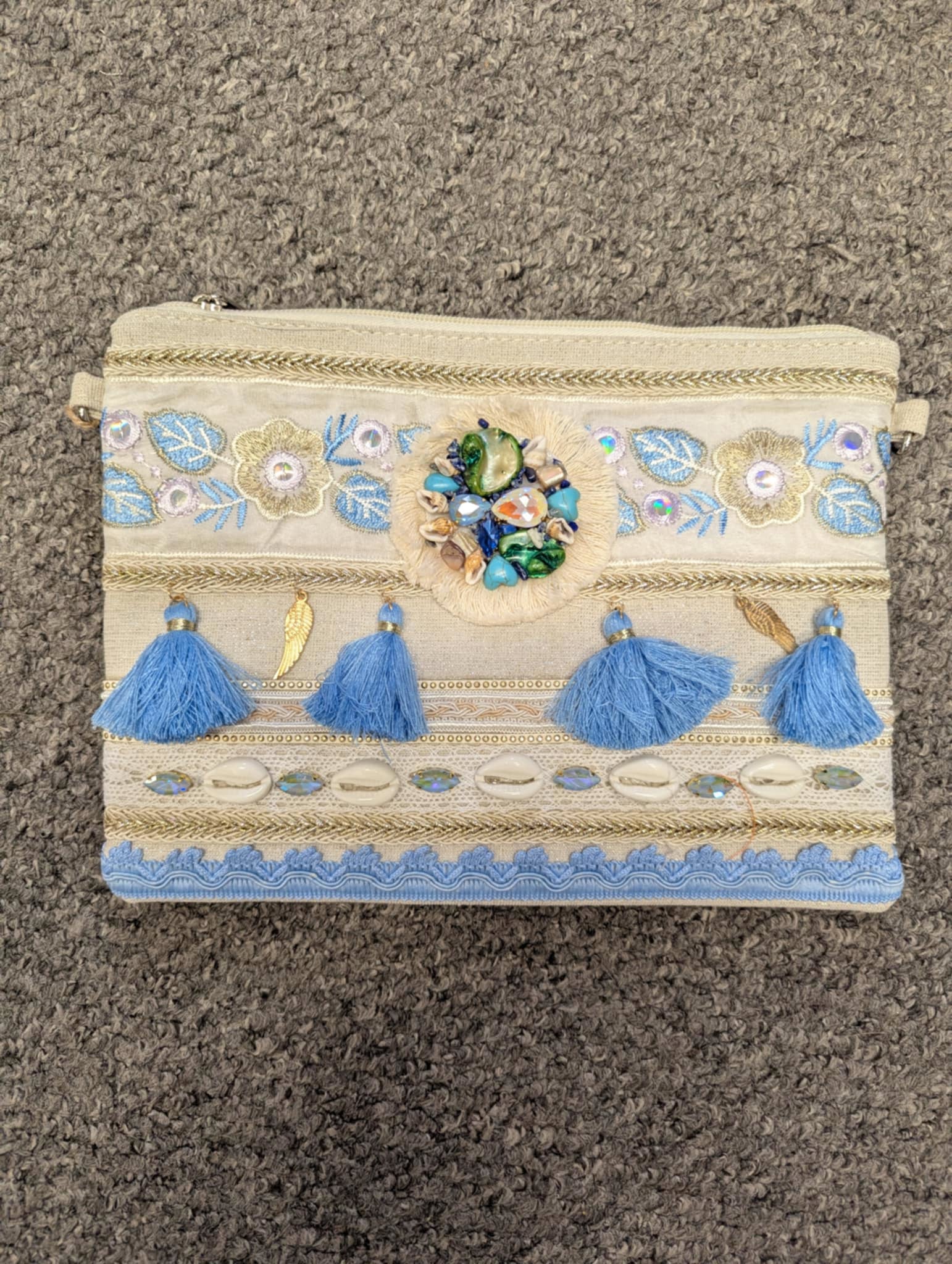 We are in love with this stunning boho bag. Canvas style with embroidery, crochet, tassels, shells and wing detail. Comes with shoulder and hand strap. Don't miss out on this one.