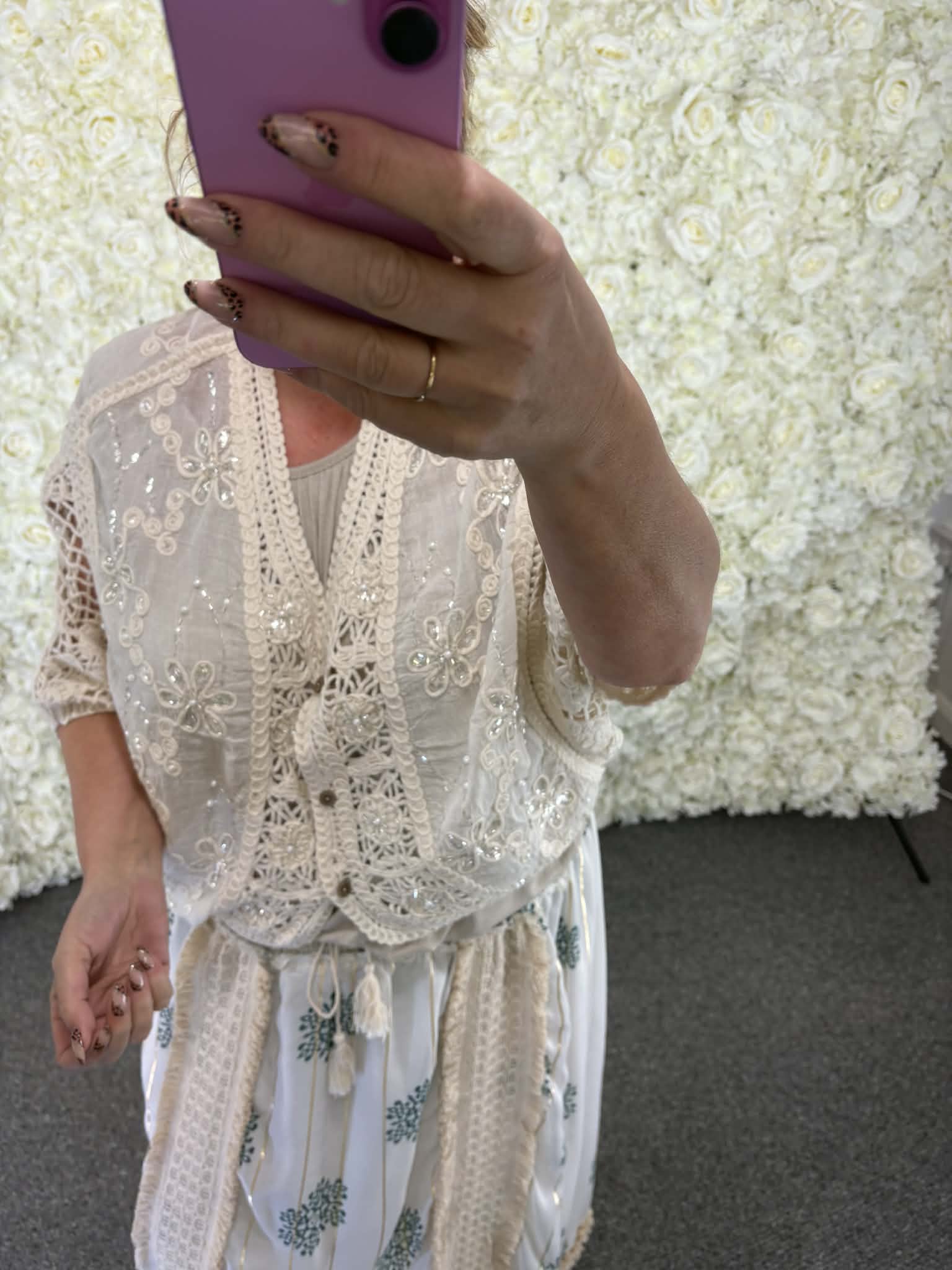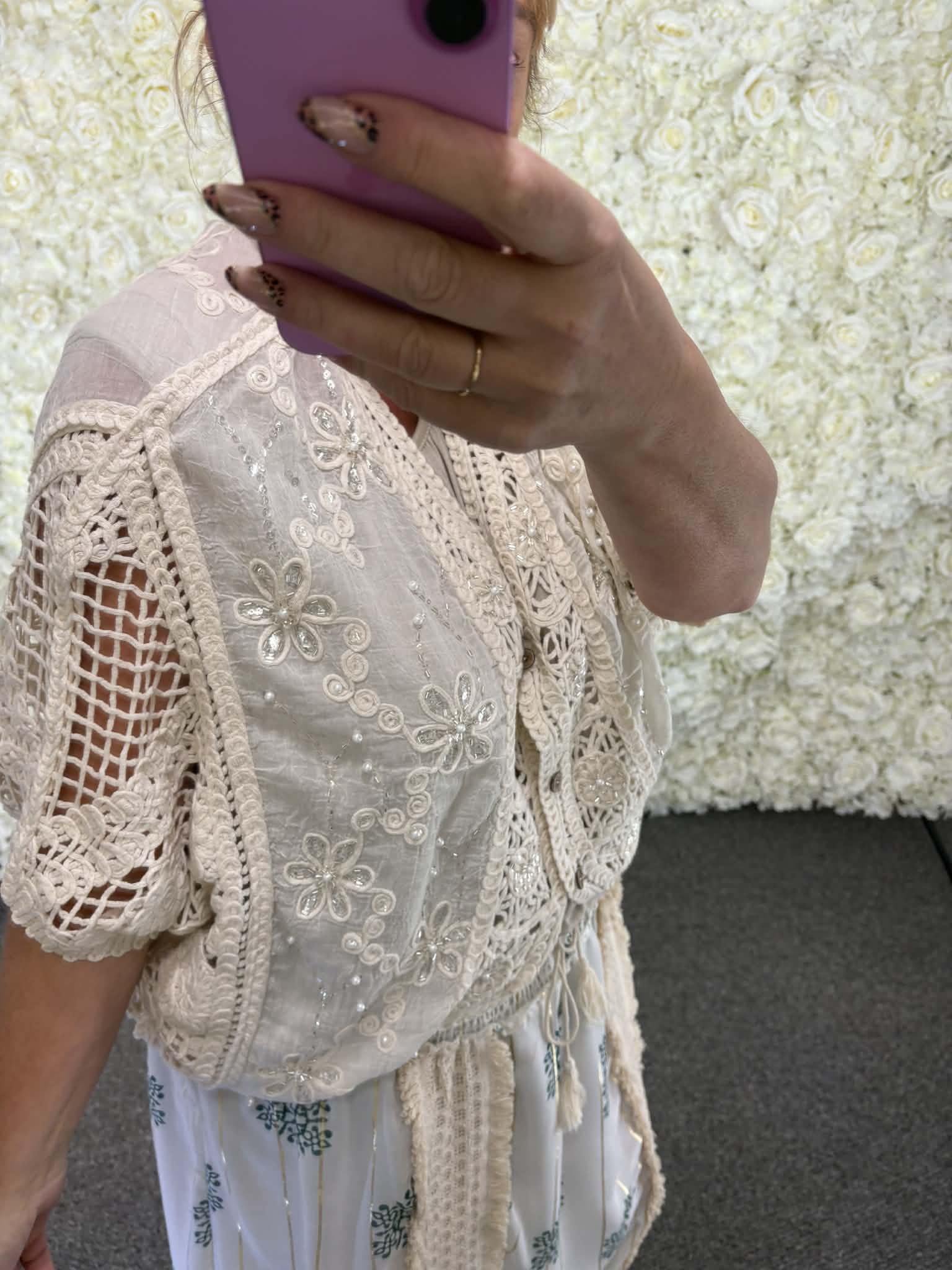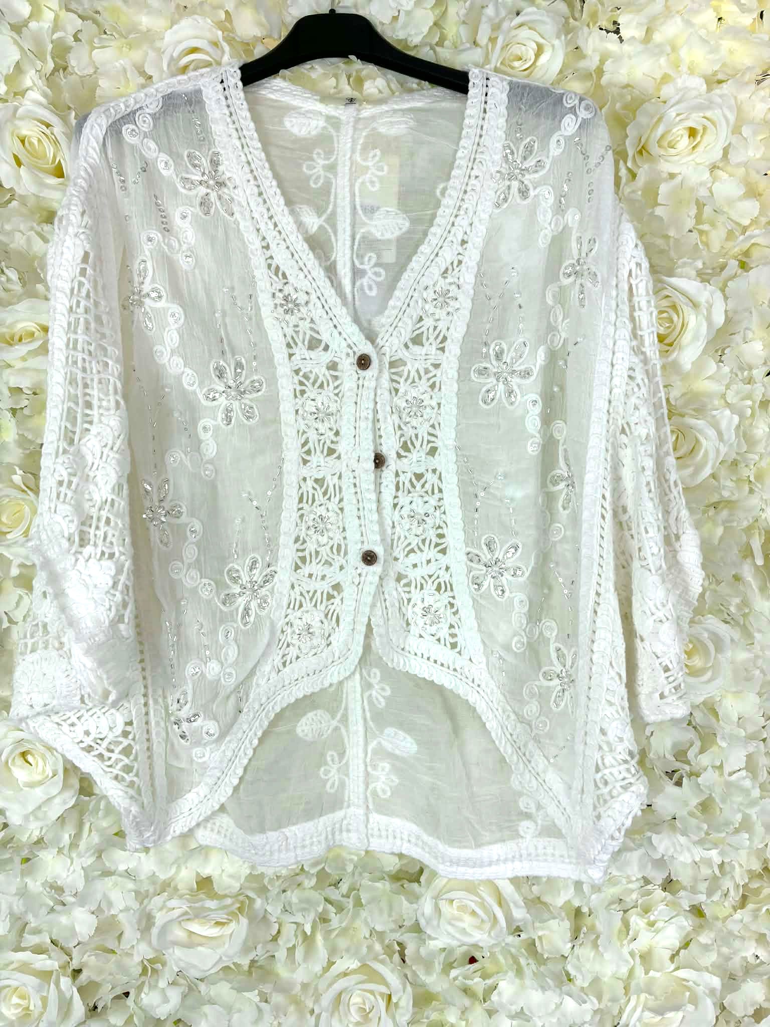 Our new Idalia vardigan is full of style. Beautiful intricate crochet detail, finished off with stunning sequin detail. This is a stunning item that is perfect to wear over a nice vest or blouse especially in the evenings on holiday.