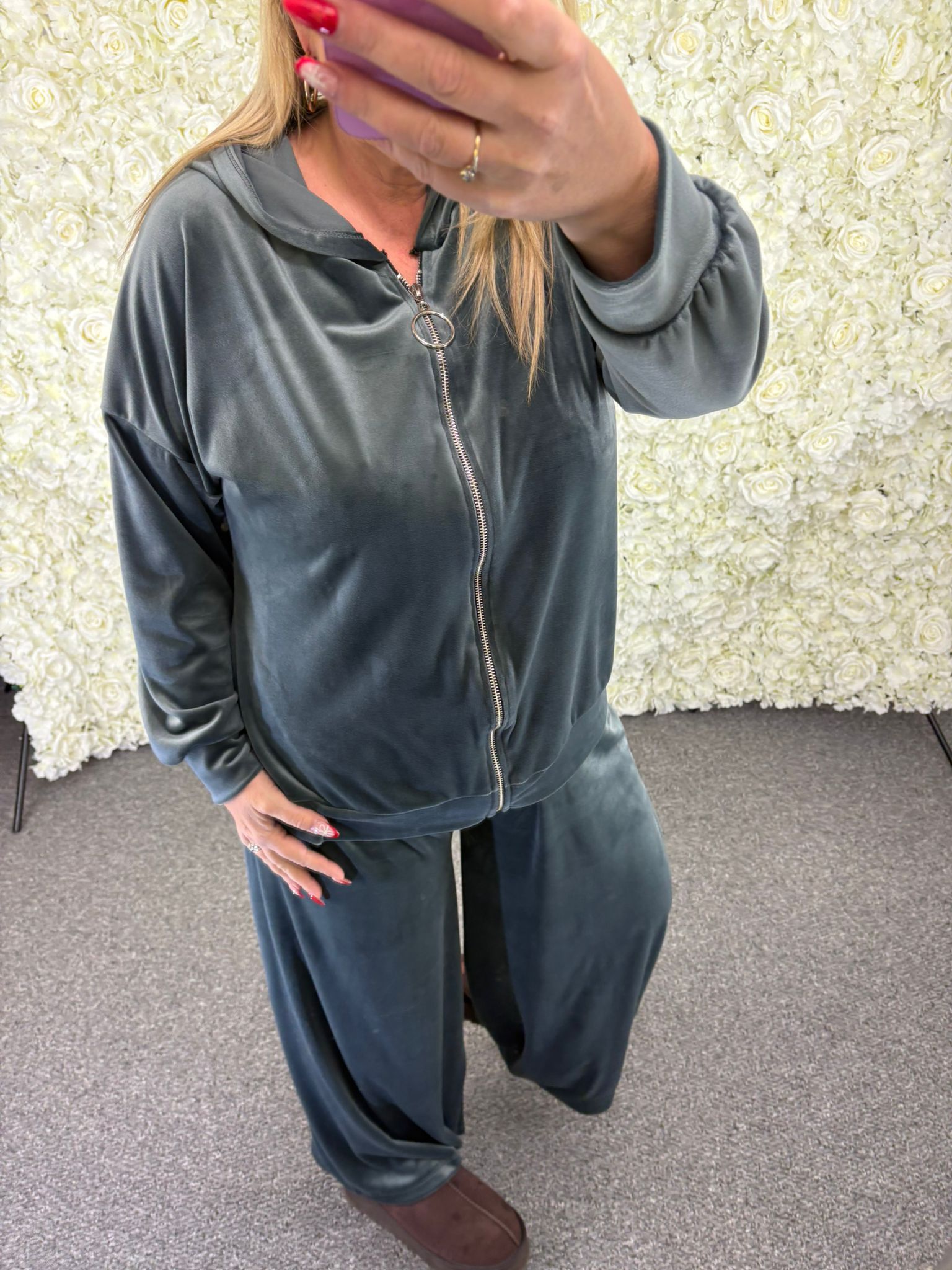 We are totally in love with our new Kassy loungesuit. In a velour fabric, it is both super soft and super stretchy. The zip up top is hooded with cuffed sleeves. The trousers are elasticated waist and a wider leg. Don't miss out on this one at this great price.