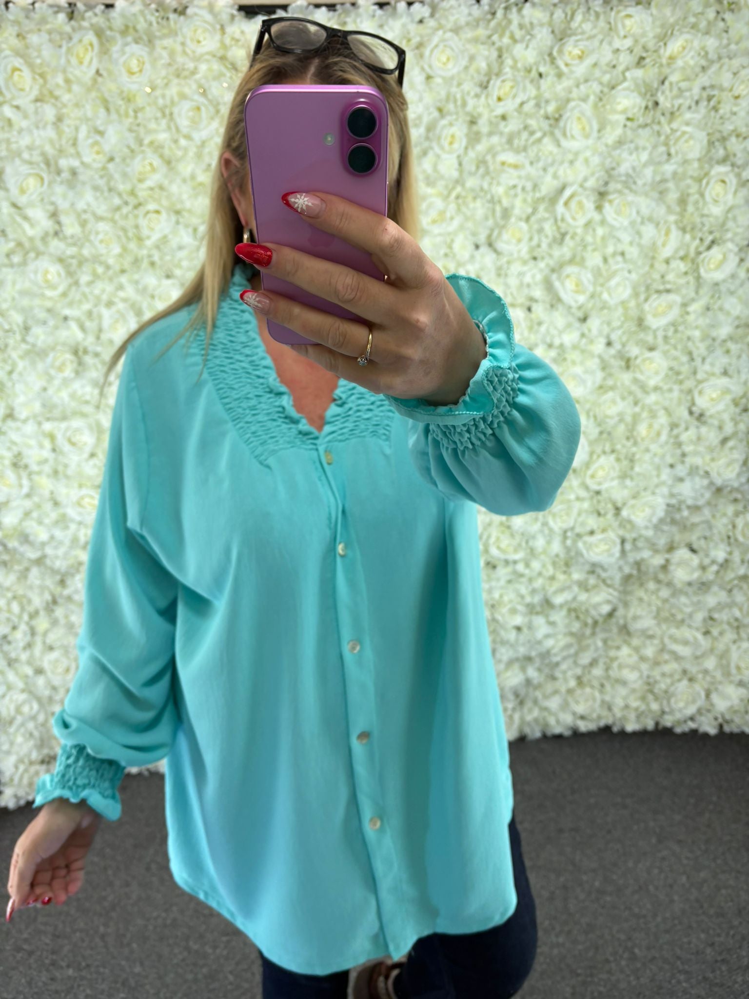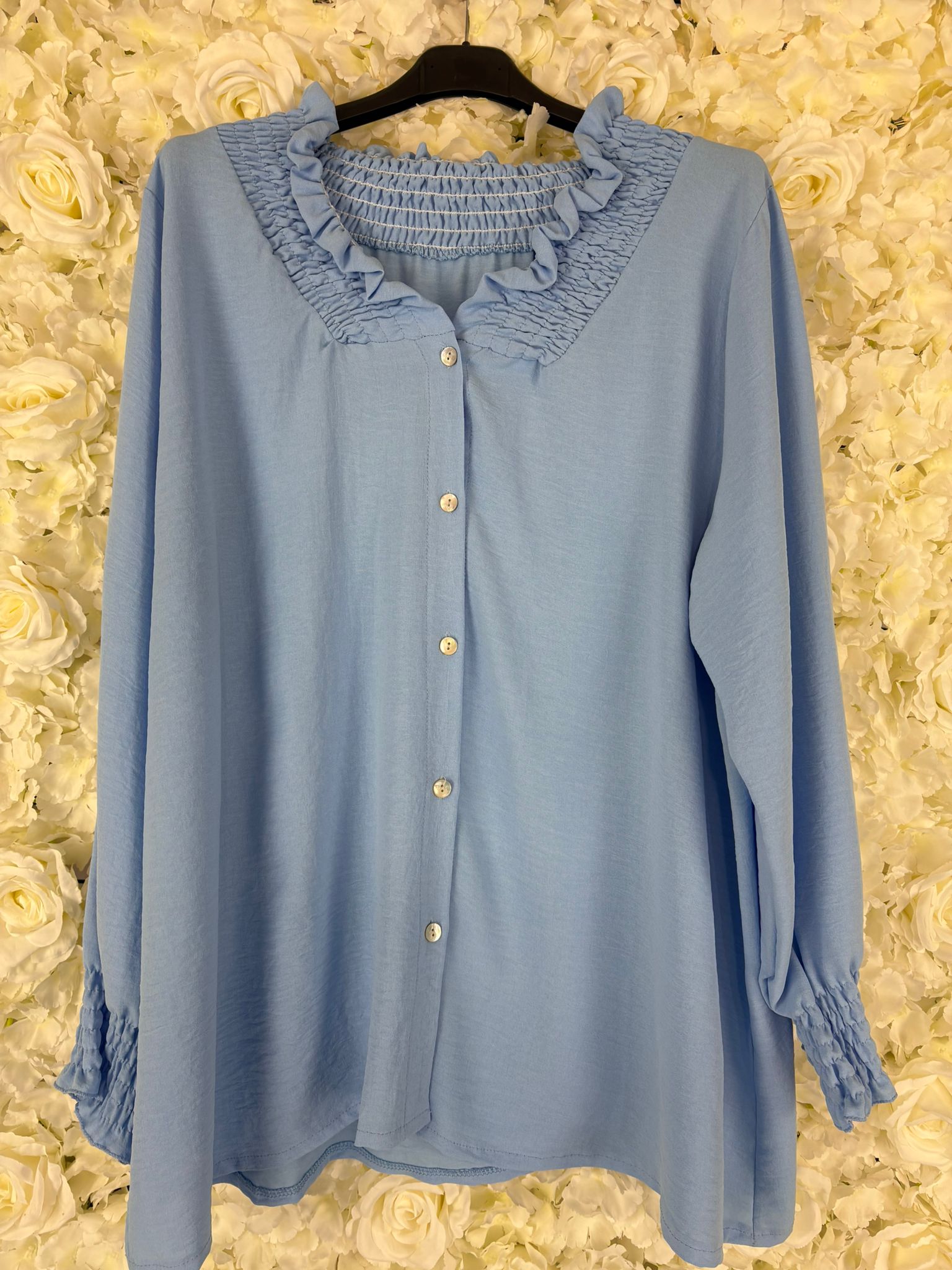 Love, love, love. Don't miss out on this beatiful blouse. As we start to come into spring, this is perfect for either everyday wear or to go out for an evening. Ruffle detail around the V neck and sleeves, button up front as well. Grab these quickly before they go.