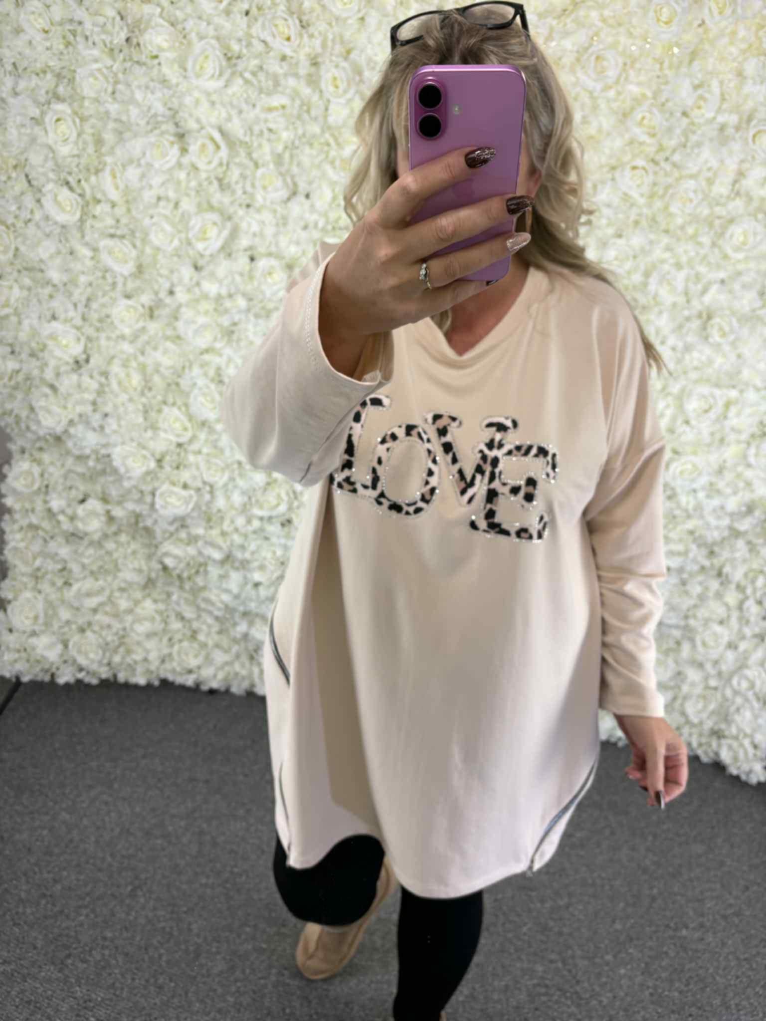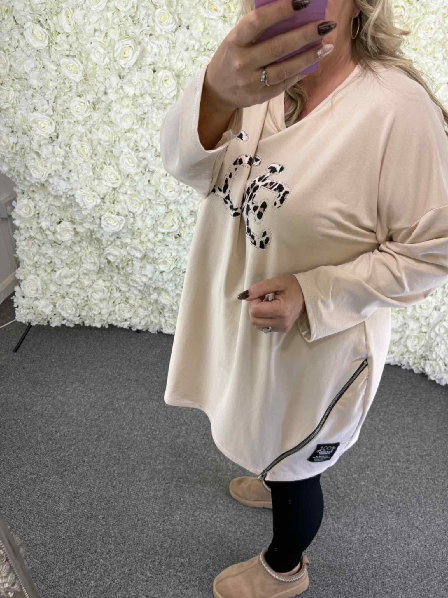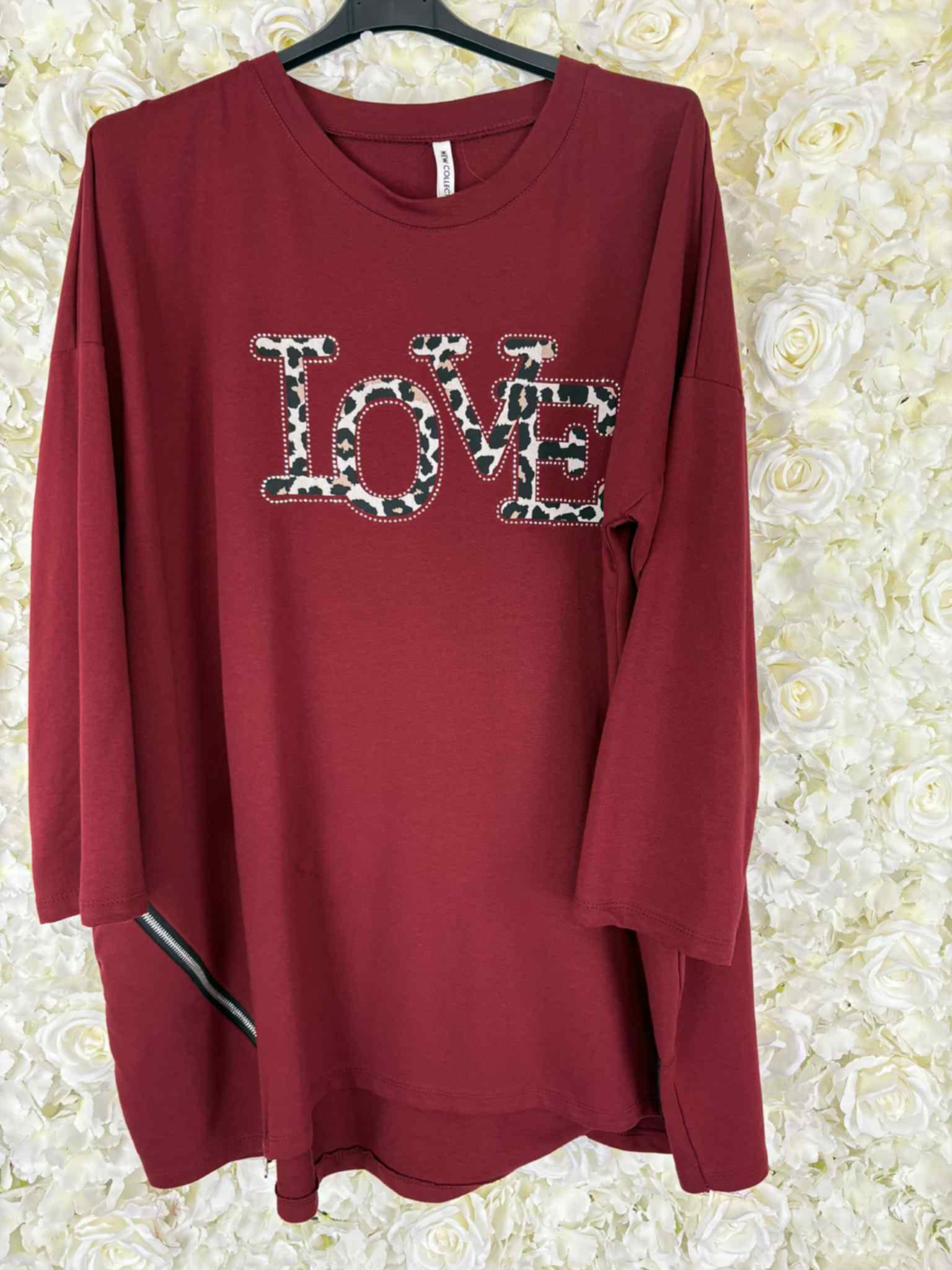 Our new Lyra sweatshirt is perfect for the new season. A medium weight material with leaopard print love surrounded by rhinestones to really make it sparkle. Finished off with zip details to the sides. You really wont want to miss this one.