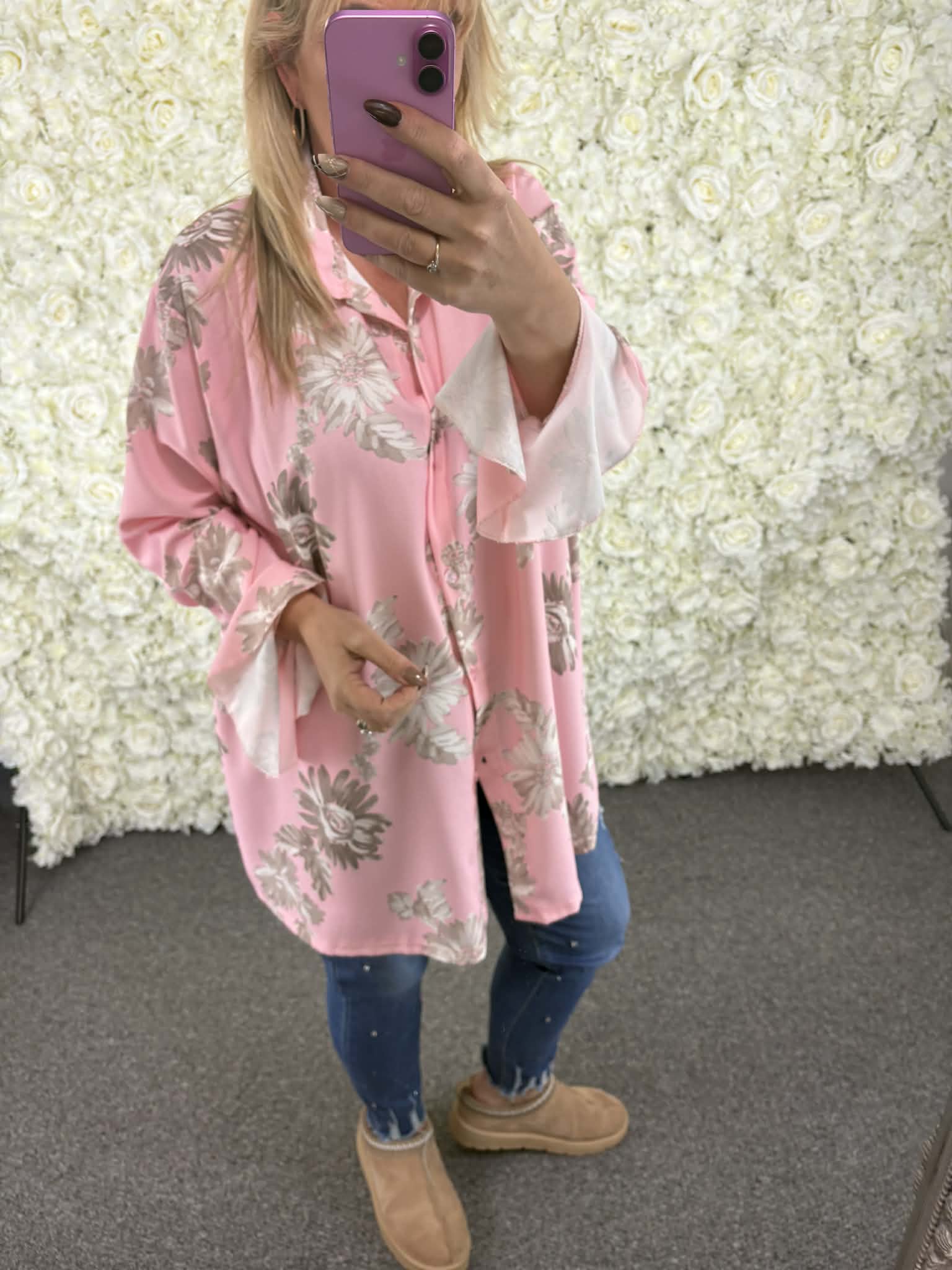 Soft, silky feel, bright colours and a stunning floral print. We are totally in love with this beautiful new blouse. Button up front with collars and a frill/ruffle bell style sleeve. These will not be around for long so grab yours now.