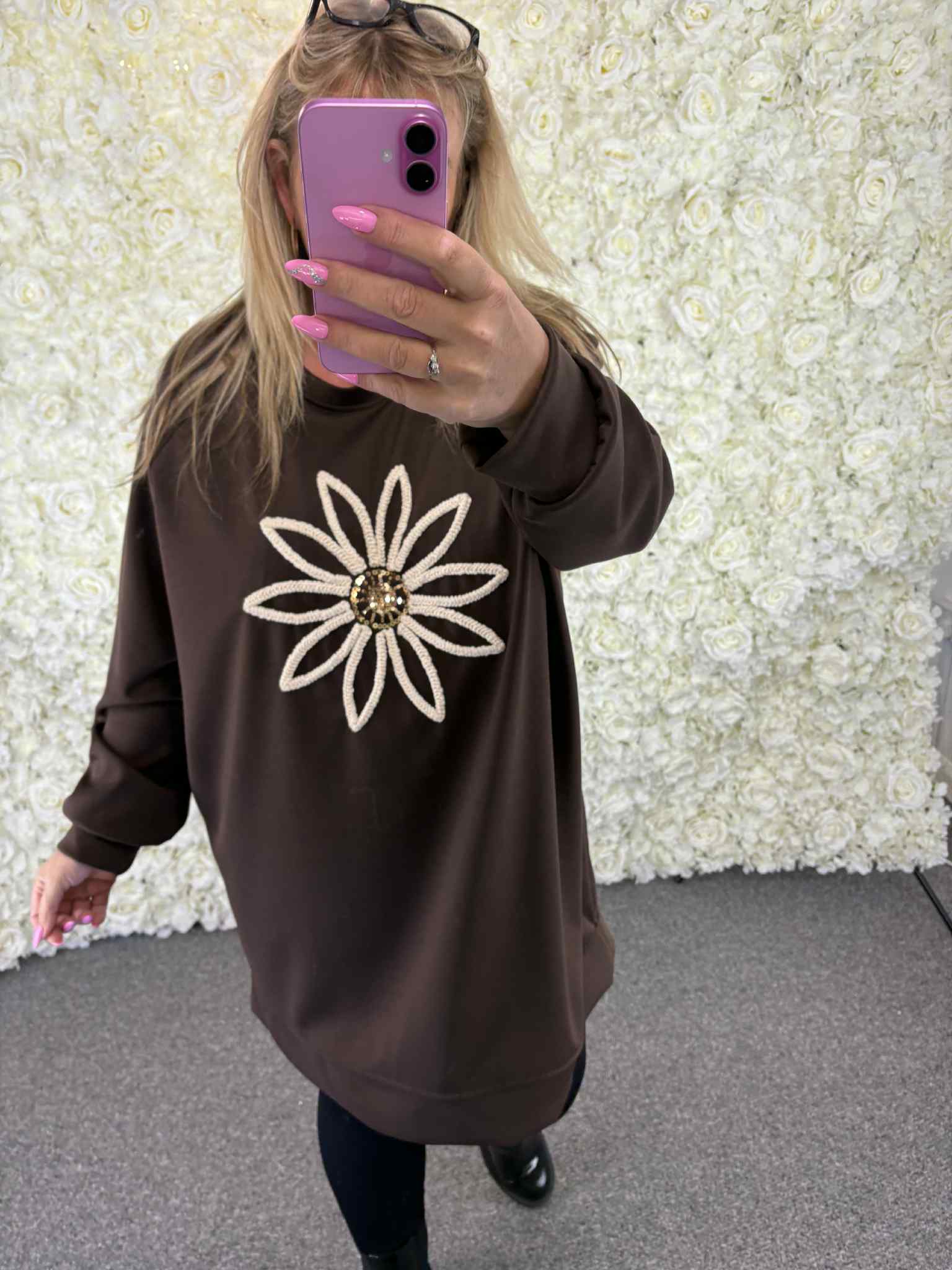 Gorgeous new scuba sequin sweatshirt, perfect for any occasion. This free size sweatshirt fits sizes 14 to 24. The model, standing at 5ft 1, wears a size 20, showcasing the comfortable fit.